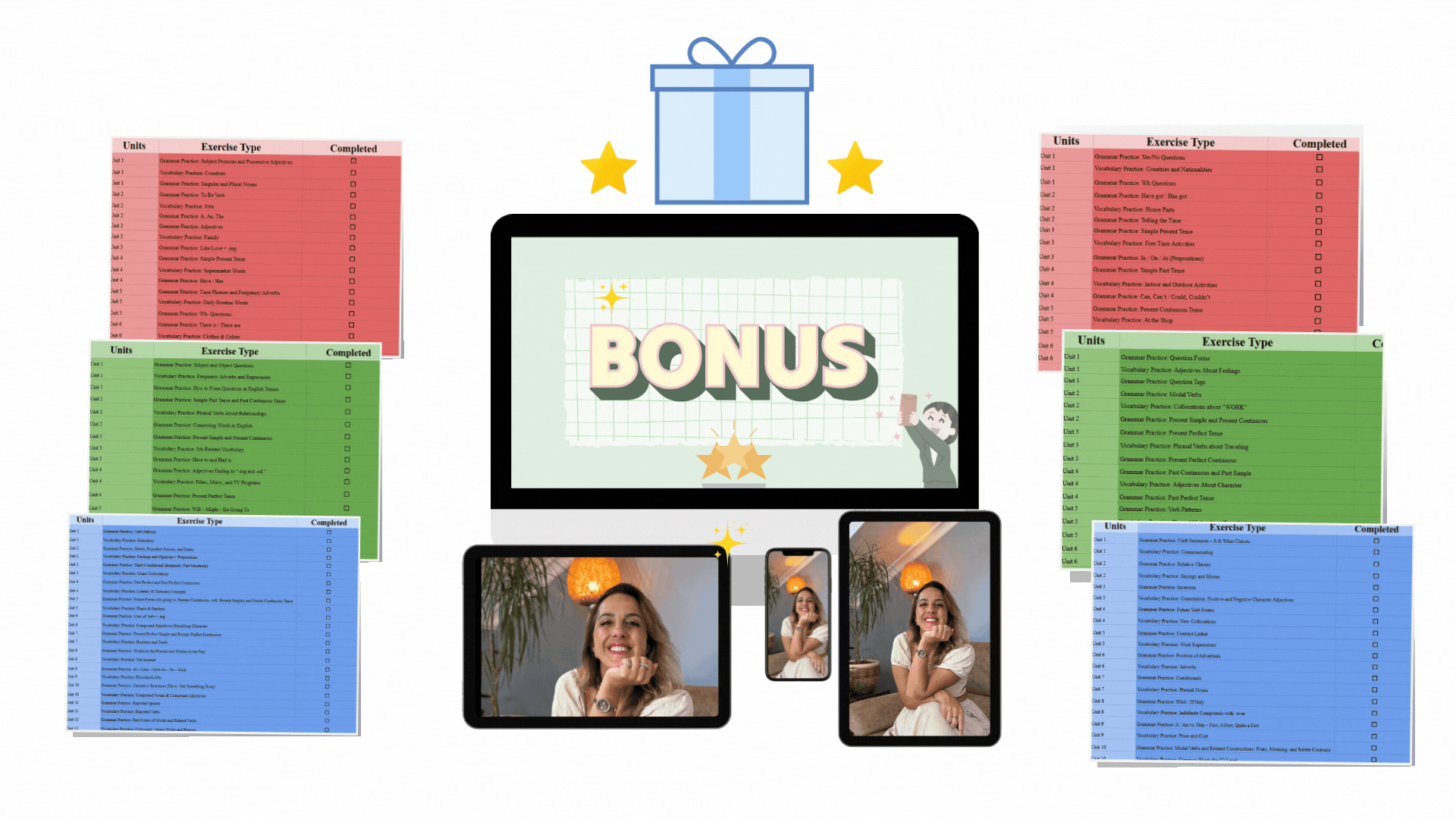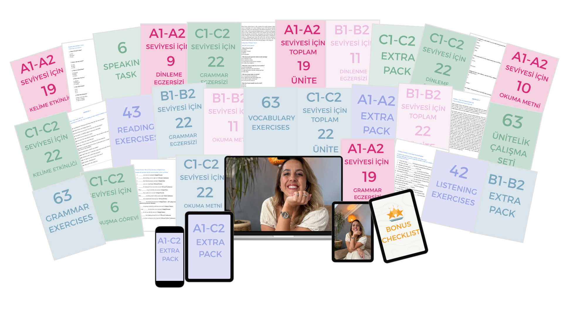 A1’den C2’ye seviye seviye ayrılmış bütün yeteneklere odaklı alıştırma seti! Bol bol pratik yapman için oluşturduğumuz yüzlerce alıştırma bu pakette bir arada!